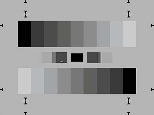 两个9阶灰度块排列在灰色背景上(D≈0.75),灰阶对数刻度(伽马=0.45)。一个最佳伽马校正相机产生输出两个9阶逆向电流线性步进信号。灰度刻度为对数级别(伽马=0.45).利用两
